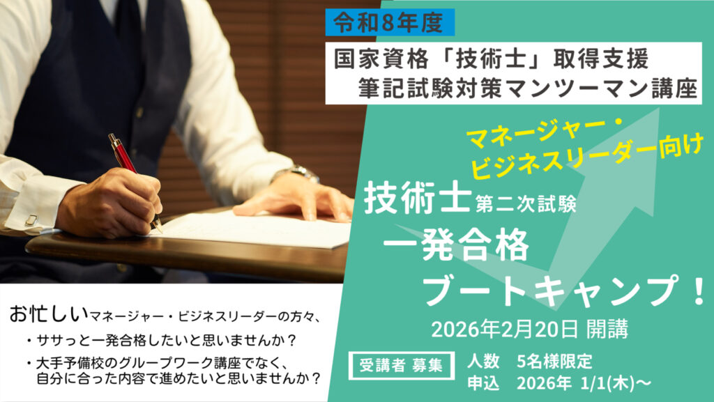 大手予備校講師経験者が、難関「技術士第二次試験」の筆記試験対策支援サービスを大手と同等品質で提供、お忙しいマネージャー・ビジネスリーダーの方々の状況に合わせてマンツーマンで伴走支援し、一発合格に導きます。